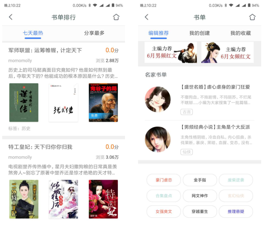 用戶的書單會有評分,在介紹欄的右上方還會出現(xiàn)“瀏覽次數(shù)”或者“分享次數(shù)”來吸引用戶查看或者激勵單主創(chuàng)作。此外,還有“名家書單”來刺激KOL生產(chǎn)內(nèi)容并吸引用戶。