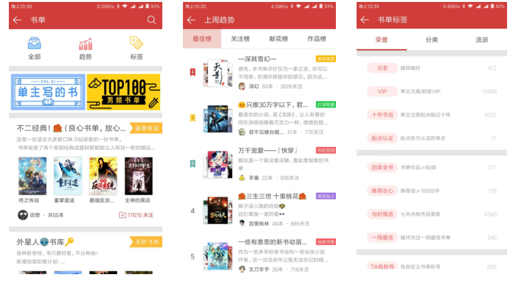 我們可以看到有“趨勢”、“標(biāo)簽”甚至“TOP100”等各種各樣的分類,給了單主們極大的曝光空間。當(dāng)然這也是與起點讀書具有龐大的版權(quán)資源和網(wǎng)絡(luò)小說天生標(biāo)簽屬性強的特點所決定的。