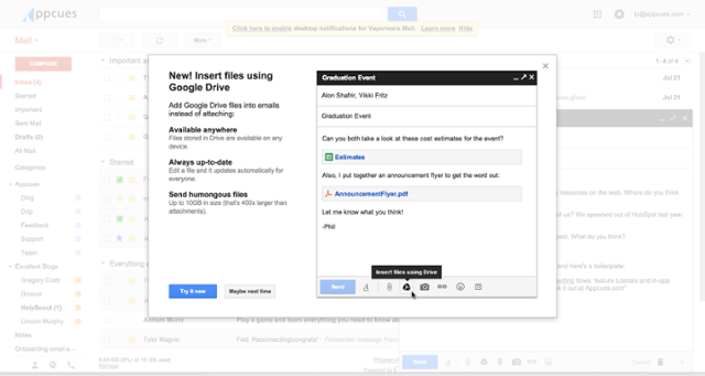 Google另外一種提高用戶參與度的方法是保持產(chǎn)品間的高度整合性。Gmail是Google最受歡迎的產(chǎn)品之一,它也被認(rèn)為是Google商業(yè)工具套件的核心。Google把其它產(chǎn)品更好的整合進(jìn)了Gmail之后,老用戶對(duì)其它產(chǎn)品的參與度很可能會(huì)提升。如下案例,Google發(fā)布了整合Drive功能的Gmail。
