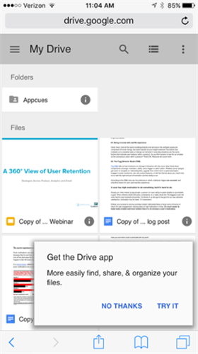下圖很好的展示了Google如何促使用戶從瀏覽器體驗(yàn)轉(zhuǎn)到原生應(yīng)用:用戶在使用網(wǎng)頁(yè)版時(shí),通過(guò)彈窗提示引導(dǎo)用戶使用體驗(yàn)更好的原生應(yīng)用。