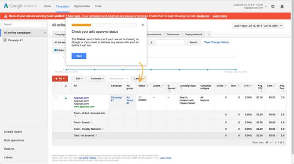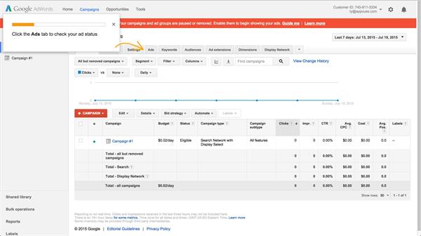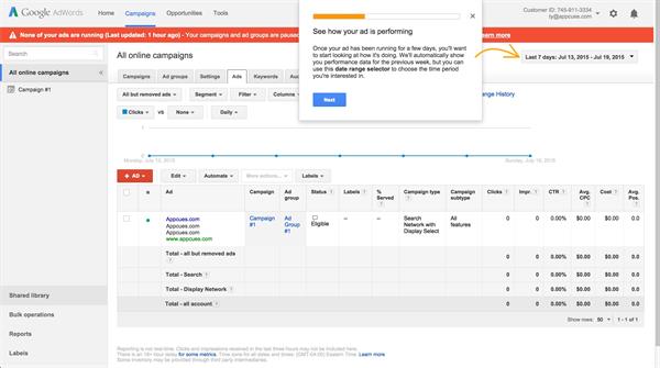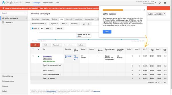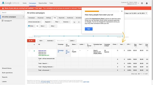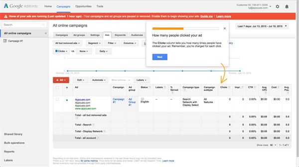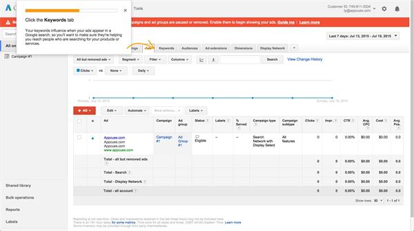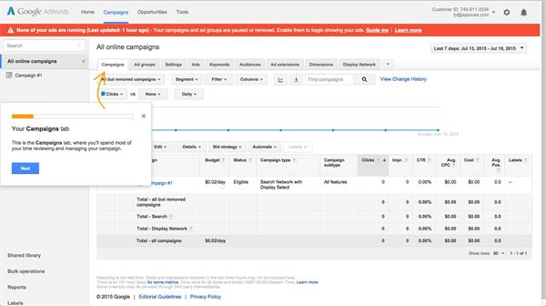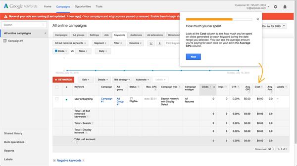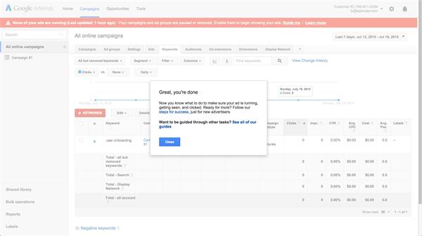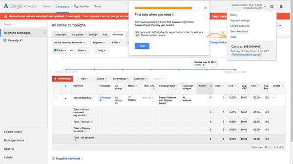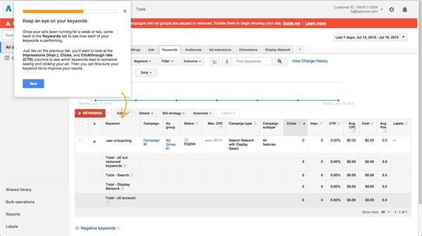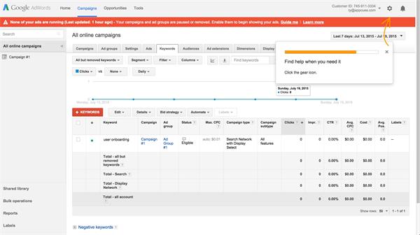 這種引導(dǎo)可以用來(lái)教育新用戶開始使用一個(gè)相對(duì)復(fù)雜的產(chǎn)品。它的目標(biāo)是減少新用戶一開始不知道該干什么的情況。這個(gè)功能在Adwords里存在已久,足以推測(cè)出,這個(gè)功能成功的提高了平臺(tái)的用戶接受度。