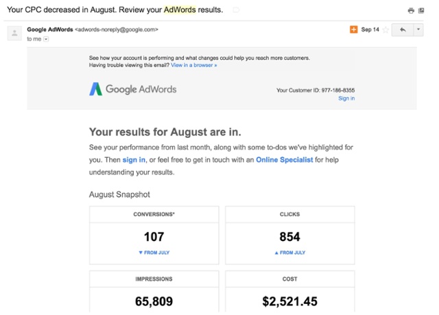 AdWords每月會(huì)發(fā)送一份關(guān)于廣告表現(xiàn)的數(shù)據(jù)總結(jié)報(bào)告,從而吸引用戶繼續(xù)使用這個(gè)產(chǎn)品。