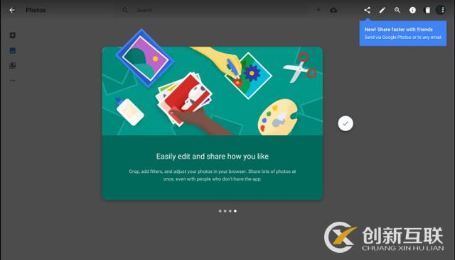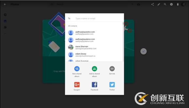 上面是Google Photos的界面截圖。藍(lán)色提示氣泡指向的是一種新的分享方式。當(dāng)你點(diǎn)擊分享按鈕,會(huì)打開如下分享界面: