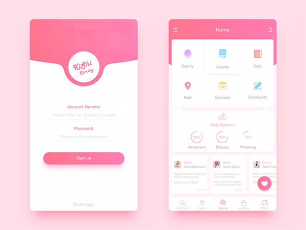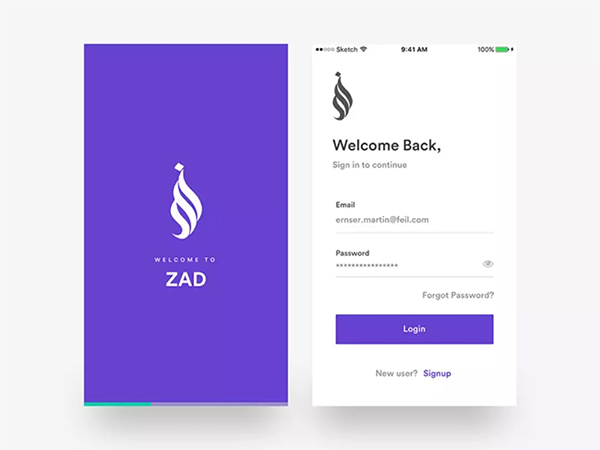 雖然與白色相比,藍(lán)紫色會(huì)更具吸引力,但在左圖中,我們卻發(fā)現(xiàn)中間白色的logo更為吸引,這是因?yàn)榱舭祝車鷽]有任何元素干擾。再看看右圖,界面雖然有很多元素,但最吸引人的依然是藍(lán)紫色的按鈕,這是因?yàn)榕c界面的其他顏色相比,藍(lán)紫色更為搶眼,因而成為視覺焦點(diǎn)。
