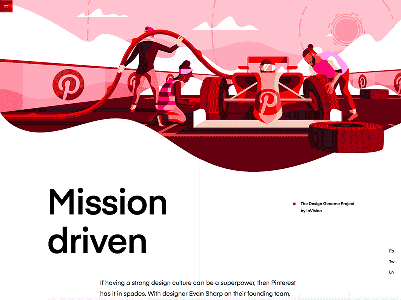 其中翹楚就是Invision,在蘇格蘭插畫(huà)家Jack Daly的帶領(lǐng)下,設(shè)計(jì)出一系列獨(dú)特的風(fēng)格。從2017年八月推出的設(shè)計(jì)指南DesignBetter.Co,到今年三月發(fā)表的設(shè)計(jì)團(tuán)隊(duì)研究專(zhuān)案The Design Genome Project,一氣呵成的視覺(jué)饗宴。