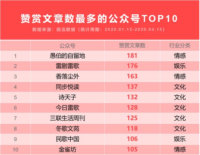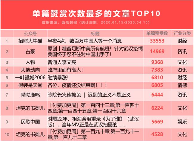 那么,什么樣的內(nèi)容可以吸引用戶付費呢?根據(jù)西瓜數(shù)據(jù)所收錄的 500 萬公眾號發(fā)文數(shù)據(jù)進一步觀察,通過贊賞文章數(shù)最多的公眾號TOP10,以及單篇贊賞次數(shù)最多的文章TOP10 中,文化和資訊行業(yè)的公眾號發(fā)文內(nèi)容更容易獲得讀者的贊賞。