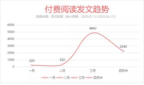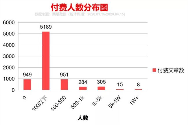 如今微信付費閱讀灰度測試已經(jīng)過去三個多月了,根據(jù)微信方面消息,參與灰度測試的訂閱號中,目前已經(jīng)有超過 2 萬個公眾號開通了付費功能。除開“好運哥”單篇收入 81 萬元的被刪文章,其中高收入的一篇文章達 70 萬元。據(jù)透露, 2020 年微信將在內(nèi)容付費上有更多動作。那么微信付費閱讀到底能不能賺錢,西瓜數(shù)據(jù)監(jiān)測樣本庫內(nèi)從 1 月 15 日灰度測試開始到 4 月 15 日的所有內(nèi)容,發(fā)現(xiàn)共有 2369 個賬號發(fā)布了 7701 篇付費閱讀內(nèi)容。 下面我們將從數(shù)據(jù)層面分析付費閱讀功能的使用情況,希望能給你一些參考。