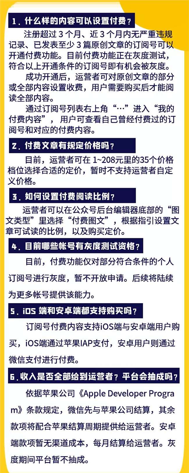2020 年 1 月 15 日,騰訊微信團隊宣布,微信正在對訂閱號付費閱讀進行灰度測試,符合測試條件的運營者可以前往公眾平臺開通付費功能。微信官方也對這一次開啟付費模式給出了相應的解釋:好的內(nèi)容創(chuàng)作者,值得更好的受益,微信平臺努力為優(yōu)質(zhì)的內(nèi)容創(chuàng)作者提供更多能力,讓創(chuàng)造價值的人體現(xiàn)價值。那么付費功能具體是什么?微信團隊對訂閱號付費能力的細節(jié)解答如下: