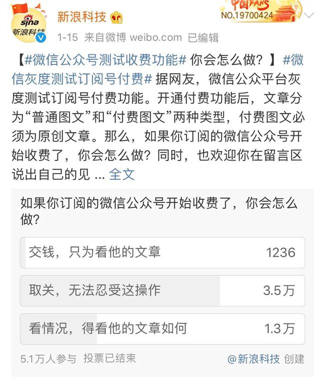 面對微信團隊投下的“重磅炸彈”,新浪科技在微博上發(fā)起了投票調(diào)查,通過“如果你訂閱的微信公眾號開始收費了,你會怎么做?”調(diào)查了解用戶對此事的態(tài)度。其中,大約七成網(wǎng)友表示會取關,剩余大部分網(wǎng)友表示,會看文章具體情況而定,只有大約2%-3%的網(wǎng)友選擇了付費閱讀。