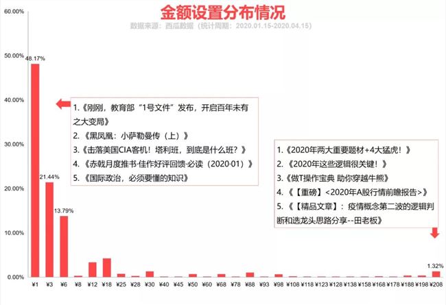 據(jù)悉,在灰度測試中,微信后臺提供了1- 208 元之間共 35 個收費檔位給運營者們選擇,暫不支持自定義金額。西瓜數(shù)據(jù)監(jiān)測到的這 7701 篇付費閱讀內(nèi)容其中包含 29 個檔位,近一半的付費文章設置最低檔位 1 元,占比48.17%,其次為 3 元檔和 6 元檔,分別占比21.44%和13.79%。由此可見,多數(shù)賬號處于付費閱讀嘗鮮期,以低額收費試水。此外,也有一些賬號直接將金額設置為 208 元作為開場,統(tǒng)計到共有 102 篇付費內(nèi)容,其中股評類內(nèi)容占多數(shù),考慮到股民圈子都是高活躍度高粘性的粉絲群體,消費需求和消費能力都高于其他領域,趨勢預測類文章只要應驗過一次,對于每個付費用戶來說,獲得的收益就遠大于相關付費內(nèi)容的高額定價,而付費用戶也會像滾雪球一樣越滾越大。