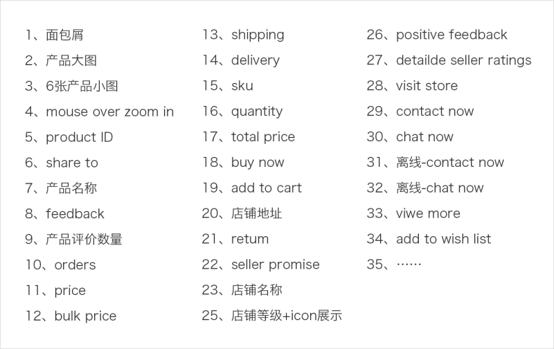 首先,我們把產(chǎn)品詳情頁(yè)所有的信息都羅列出來,有產(chǎn)品圖片、產(chǎn)品SKU、產(chǎn)品所屬店鋪等信息,大大小小一共有30多條,這還不包括輔助性內(nèi)容,如下圖:
