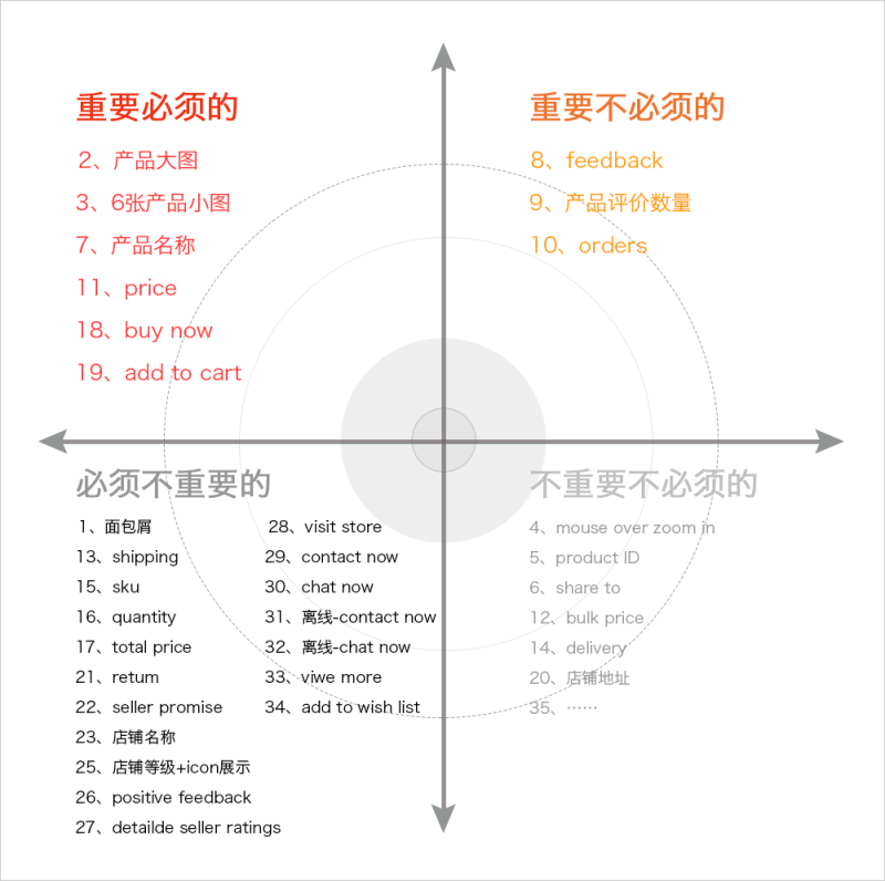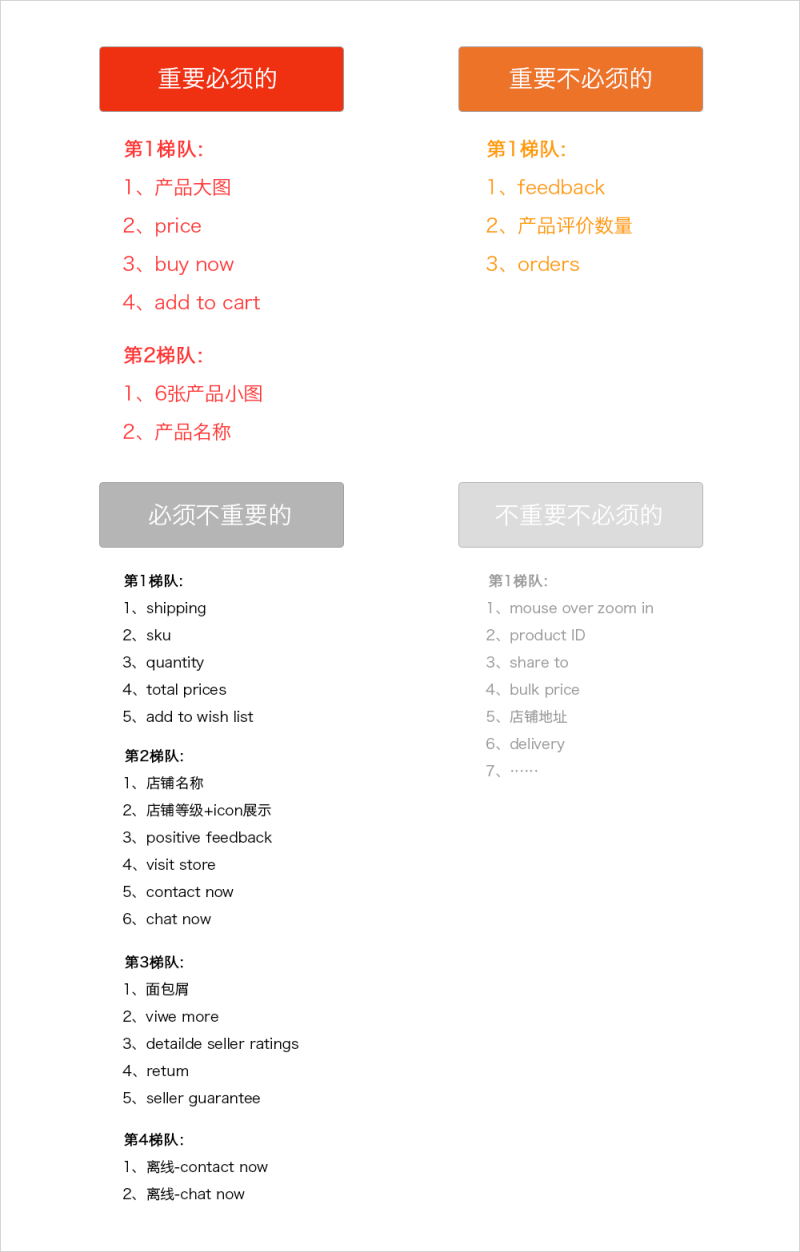 羅列出來之后,再按照前面說的十字法,把上述信息全部按照這四個(gè)象限進(jìn)行分類,根據(jù)優(yōu)先級(jí)的不同,分別填到相應(yīng)的象限里,像產(chǎn)品的圖片、名稱、價(jià)格等都屬重要且必須的內(nèi)容,如下圖: