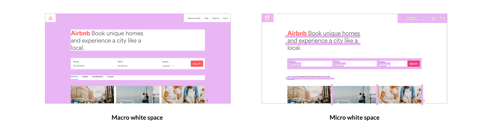 留白有不同的類型。文本的行間距和網(wǎng)格之間的間隙屬于小留白,它讓內(nèi)容具備了更強(qiáng)的可讀性。而頁面中大面積無內(nèi)容的區(qū)域則是大留白,它們讓視覺更容易向內(nèi)容聚焦。