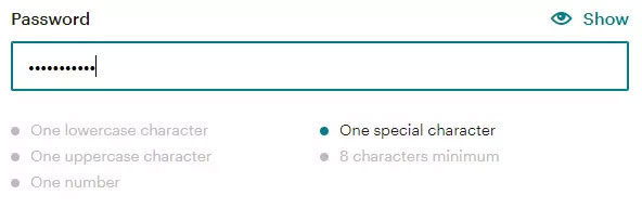 MailChimp的注冊表單執(zhí)行符合條件的標準,更改后顏色將更改。 在此示例中,我忘記為密碼輸入包括至少一個特殊字符。