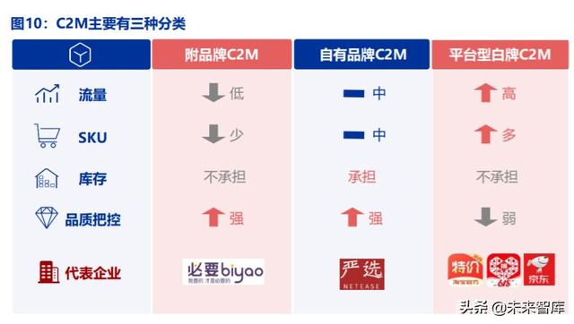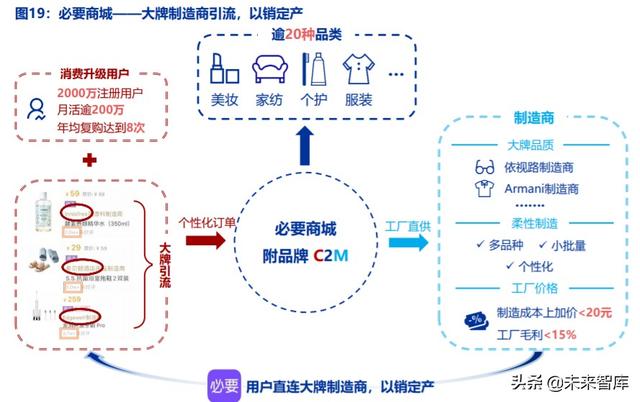 ? 我們根據(jù)各電商商城平臺(tái)對(duì)品牌的依附程度將C2M分為附品牌C2M、自有品牌C2M、平臺(tái) 型白牌C2M,附品牌類(lèi)C2M主要依靠知名品牌制造商概念來(lái)引流,自有品牌C2M主要 吸引對(duì)自身品牌有信賴度的客群,平臺(tái)型白牌C2M則面向平臺(tái)上所有用戶。