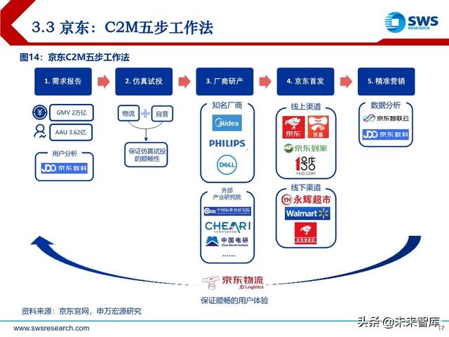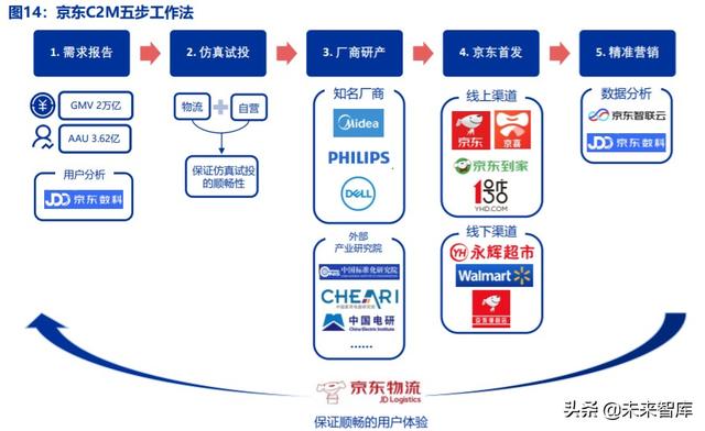 ? 京東:C2M五步工作法,從需求報(bào)告——仿真試投——廠商研產(chǎn)——京東首 發(fā)——精準(zhǔn)營(yíng)銷(xiāo),最后在京東自營(yíng)物流的服務(wù)下為用戶提供極佳的體驗(yàn)。