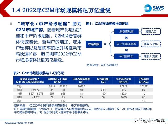 ? “城市化+中產(chǎn)階級(jí)崛起”助力 C2M市場(chǎng)擴(kuò)容。隨著城市化進(jìn)程加 速和中產(chǎn)階級(jí)崛起,C2M消費(fèi)者群 體快速增長(zhǎng)。新用戶的增加、老用 戶留存以及復(fù)購(gòu)率的提升將推動(dòng)市 場(chǎng)快速擴(kuò)容,我們測(cè)算2022年C2M 市場(chǎng)規(guī)模將達(dá)到萬(wàn)億量級(jí)。
