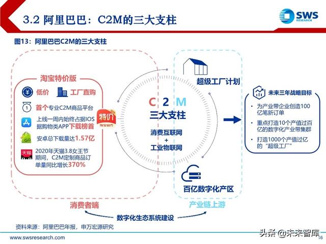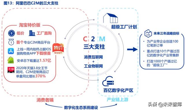 ? 阿里巴巴:整合淘寶特價(jià)版+超級(jí)工廠計(jì)劃+百億數(shù)字化產(chǎn)區(qū)這三大支柱,同時(shí)運(yùn) 用其阿里云、菜鳥(niǎo)物流等基礎(chǔ)設(shè)施,搭建連接C端用戶和M端制造商的C2M系統(tǒng)。