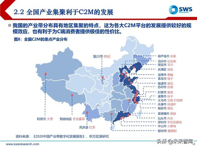 ? 我國(guó)的產(chǎn)業(yè)帶分布具有地區(qū)集聚的特點(diǎn),這為各大C2M平臺(tái)的發(fā)展提供較好的規(guī) 模效應(yīng),也有利于為C端消費(fèi)者提供極佳的性價(jià)比。