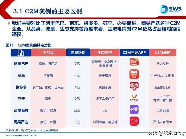 ? 我們主要對(duì)比了阿里巴巴、京東、拼多多、蘇寧、必要商城、網(wǎng)易嚴(yán)選這些C2M 企業(yè),從品類(lèi)、流量、生態(tài)支持等角度來(lái)看,主流電商對(duì)C2M依然占據(jù)絕對(duì)的話 語(yǔ)權(quán)。