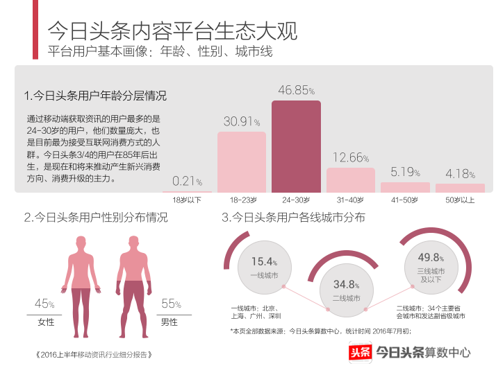 由今日頭條算數(shù)中心發(fā)布的《2016上半年移動(dòng)資訊行業(yè)細(xì)分報(bào)告》中有關(guān)于今日頭條平臺(tái)用戶的基本畫像。