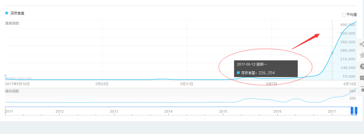 比如最近被人吐槽的《深夜食堂》,開播之前的搜索指數(shù)一直在幾千左右徘徊,6月12日開播后搜索指數(shù)直接飚至22萬(wàn),14日已經(jīng)達(dá)到了48萬(wàn)。那么,本身這部劇里面的演員自然就成了熱點(diǎn)關(guān)鍵詞。