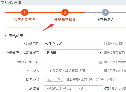5,填寫網(wǎng)站基本信息,包括網(wǎng)站開通日期,名稱等,域名證書去域名網(wǎng)站下載,服務商相關問題可以問客服,IP添加不了的換火狐瀏覽器就行,然后點擊下一步