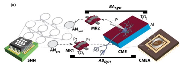 具體來(lái)講就是,研究人員利用與金屬薄膜氧化鈦微電極配對(duì)的憶阻器,將硅神經(jīng)元連接到老鼠海馬體的神經(jīng)元上(如下圖所示),從而證明了一個(gè)三神經(jīng)元腦-硅網(wǎng)絡(luò),其中憶阻突觸經(jīng)歷了由神經(jīng)元放電速率驅(qū)動(dòng)的長(zhǎng)期增強(qiáng)或抑制。