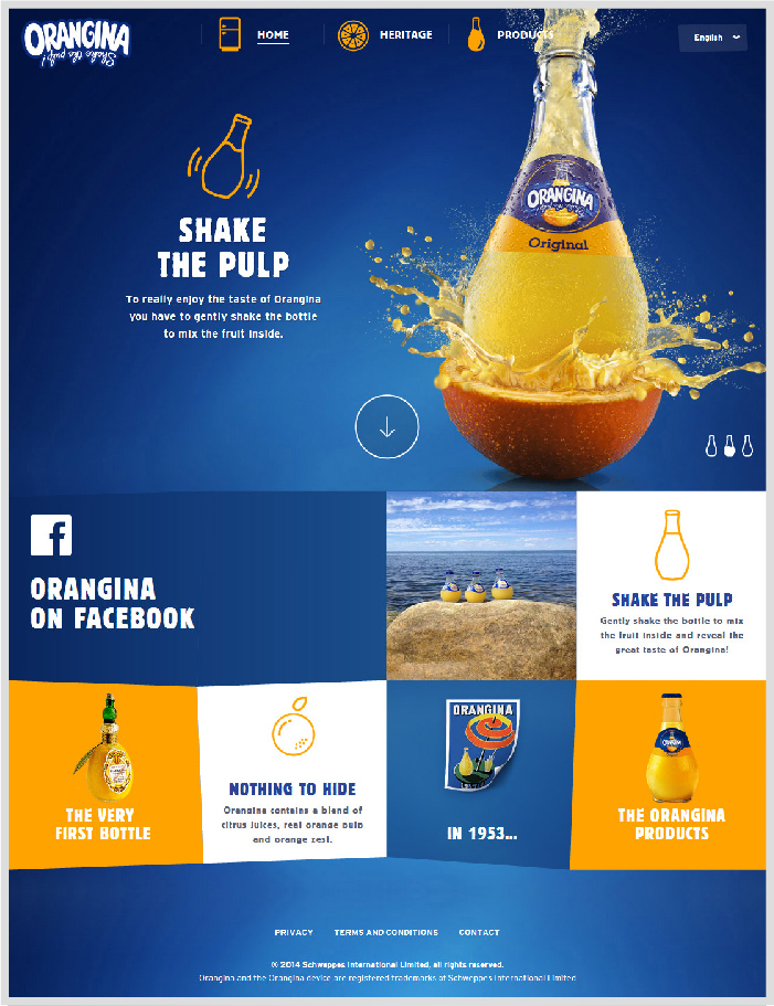 Orangina這個(gè)網(wǎng)站就是巧妙的運(yùn)用了藍(lán)色和橙色互補(bǔ)色的對(duì)比,設(shè)計(jì)者在顏色的輕重上做了很好的拿捏,整個(gè)網(wǎng)站以藍(lán)色為主,橙色為輔,加上適當(dāng)?shù)陌咨珌硐魅醭壬膶?duì)比,界面顯得效果醒目和有沖擊力。