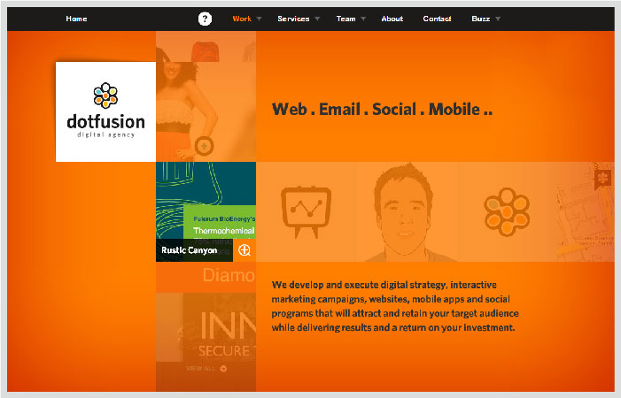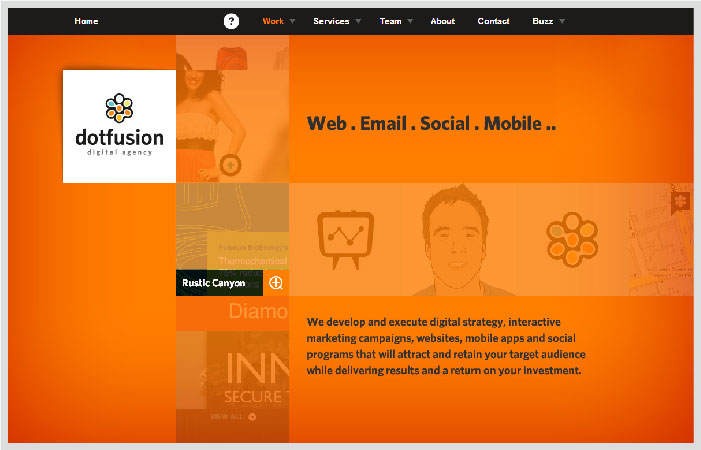 Dotfusion設(shè)計(jì)公司這個(gè)網(wǎng)站整體采用橙色調(diào),里面的一些方格也用到鄰近色來協(xié)調(diào),但這樣鄰近色之間也形成了微弱的對(duì)比關(guān)系。整個(gè)界面大的亮點(diǎn)就是左上角logo的地方,用了一個(gè)白色做底色來調(diào)和界面,接著用了一個(gè)藍(lán)綠色的色塊來點(diǎn)綴畫面,使得整個(gè)色塊和橙色形成鮮明的對(duì)比,但又和整個(gè)橙色界面可以協(xié)調(diào)的融在一起。