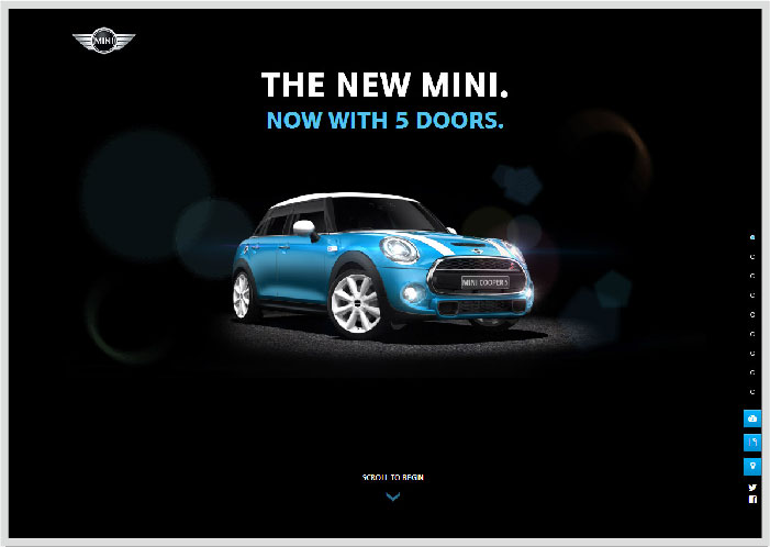 MINI 5-DOOR HATCH這個(gè)網(wǎng)頁(yè)就是采用了無(wú)彩色和有彩色的對(duì)比,整體畫面色彩對(duì)比特別明顯,容易彰顯個(gè)性和主題。黑色的底色、白色的字體和灰色logo,無(wú)彩色的黑白灰都運(yùn)用到了。有彩色選用了藍(lán)色,比較明亮,也跟產(chǎn)品的顏色相呼應(yīng)。在整個(gè)畫面當(dāng)中,倘若沒有藍(lán)色出現(xiàn),畫面會(huì)變得枯燥單調(diào),加入藍(lán)色之后,整個(gè)畫面鮮活起來了。