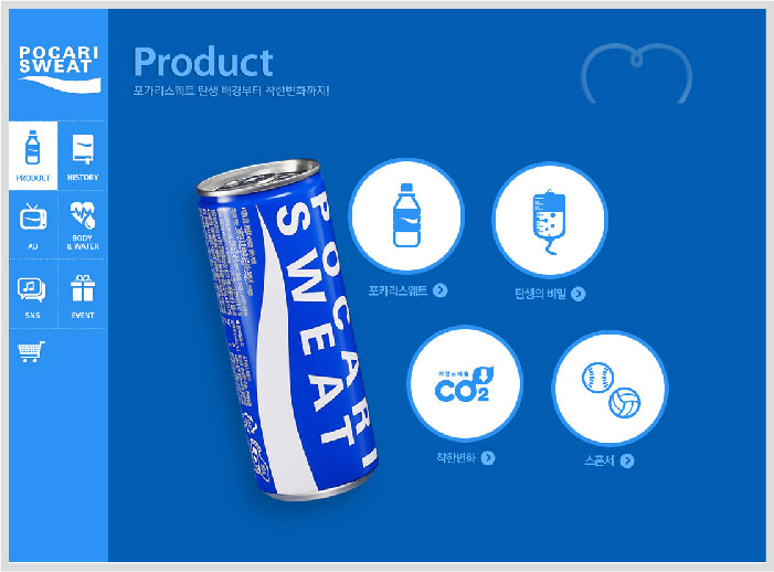 POCARI SWEAT這個(gè)網(wǎng)站就是采用了藍(lán)色的明暗對(duì)比來設(shè)計(jì)的,在這個(gè)界面當(dāng)中,右邊的深藍(lán)色顯得比較穩(wěn)重,左邊導(dǎo)航部分采用一個(gè)明亮的藍(lán)色,左右兩邊形成了鮮明的對(duì)比,這樣的界面穩(wěn)重中又帶著輕快,視覺效果也比較好。