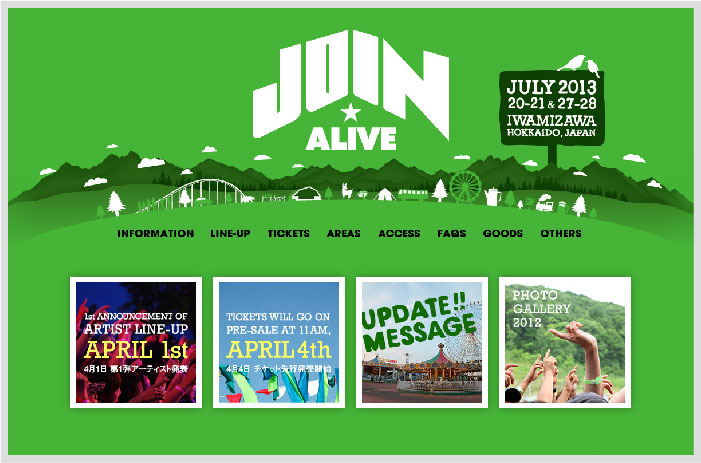 ALIVE2013年活動(dòng)這個(gè)網(wǎng)站在整個(gè)色系的把握上特別好。整個(gè)高純度的綠底到墨綠色的山脈,都可以體現(xiàn)出純度的對(duì)比。