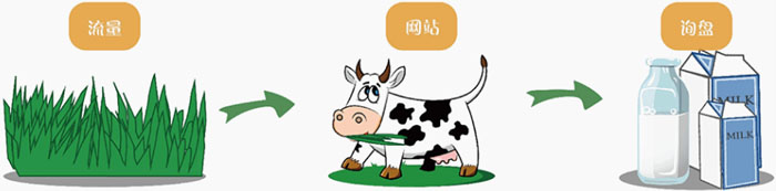 如下圖所示,牛吃下去的雖然是草,但經(jīng)過(guò)自身的消化,擠出來(lái)的卻是牛奶。理論上講,這頭牛吃下去的草越多,擠出來(lái)的牛奶也必然會(huì)越多。而“1+N”體系的原理也同樣如此——進(jìn)入到網(wǎng)站的流量越多,產(chǎn)出的詢盤也必然會(huì)越多。