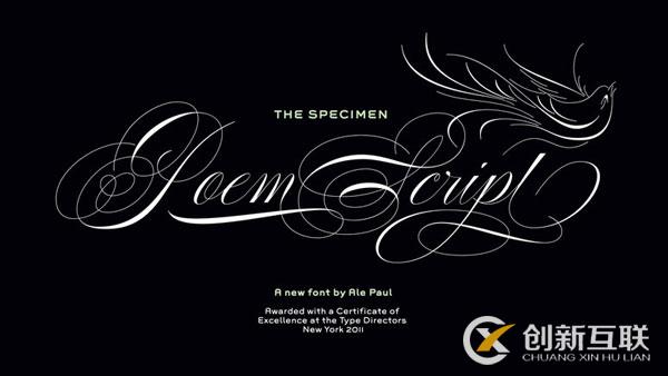 書法字體:詩腳本。在MyFonts,可用設(shè)計被描述為:“一個混合的解釋魔術(shù)19世紀(jì)晚期的美國筆腳本風(fēng)格”。