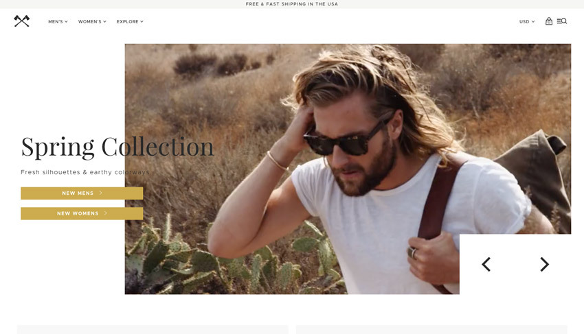 正如您在此示例中所看到的,Shwood使用“New”而不是“Shop”來將訪問者引導(dǎo)至產(chǎn)品頁面。這個CTA比“Shop Men”的行動更少,但它確實有助于告訴訪客他們正在為您的商店購買新來的人。