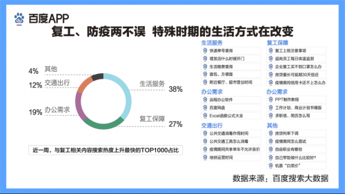 疫情防控形勢向好態(tài)勢正在拓展,經(jīng)濟生活也正穩(wěn)步走向正軌。透過百度大數(shù)據(jù)可以發(fā)現(xiàn),科技成為防疫的重要武器,在疫情得到嚴(yán)格防控的前提下,線下復(fù)工復(fù)產(chǎn)已全面推動。復(fù)工之下人們消費需求、生活服務(wù)的需求也得到正常滿足。云辦公仍舊是當(dāng)下復(fù)工的重要途徑,也為未來辦公模式帶來新的參考。