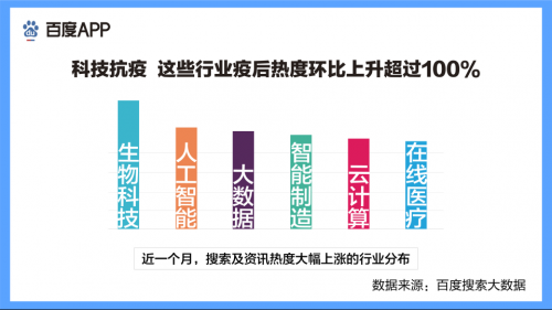 科技抗疫是疫情發(fā)生以來大家最為關(guān)注的熱點之一,因此相關(guān)新興產(chǎn)業(yè)的關(guān)注度也在近期飆升明顯。人工智能、大數(shù)據(jù)、云計算等行業(yè)熱度環(huán)比上漲超過100%。這些技術(shù)在疫苗、藥物研發(fā)、病毒研究、防控等領(lǐng)域的應(yīng)用尤其受到關(guān)注。
