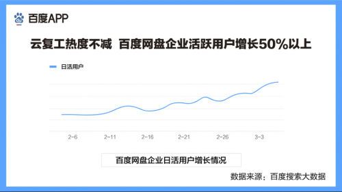 各行業(yè)線下全面復(fù)工的同時,云辦公的熱度也絲毫不減。百度搜索大數(shù)據(jù)顯示,近7天,百度網(wǎng)盤企業(yè)活躍用戶數(shù)增長在50%以上。許多企業(yè)將云辦公與線下復(fù)工兩種方式結(jié)合,減少聚集,大限度保障員工安全。
