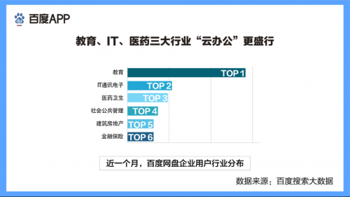 由于辦公的特點不同,云辦公也“挑行業(yè)”。 近一個月,教育、IT、醫(yī)藥三大行業(yè)的百度網(wǎng)盤企業(yè)用戶數(shù)量最多。而云辦公也為疫情期間“在線教育”、“在線醫(yī)療”等業(yè)務(wù)的發(fā)展提供了基礎(chǔ)條件。