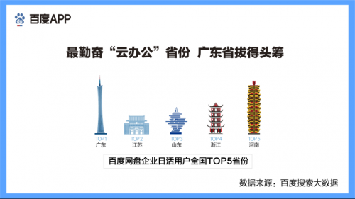 在云辦公這件事上,南方省份更積極,百度搜索大數(shù)據(jù)顯示,廣東省是云辦公最勤奮的省份。江蘇、山東、浙江、河南等省份緊隨其后,南方省份占TOP5中的三席。