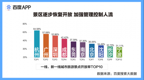 此外,疫情期間受到重大影響的旅游行業(yè)也開始逐步回溫。從百度搜索大數(shù)據(jù)全國旅游景點開放率TOP10來看,杭州、廣州、深圳等一線、新一線城市,由于原本旅游業(yè)較發(fā)達(dá),且受疫情影響相對較小,景區(qū)開放率更高。