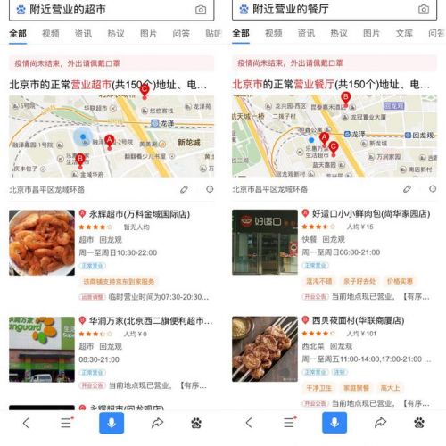 為了滿足給用戶提供切實可靠的商家信息,百度App對商戶信息及時更新,用戶搜索“附近營業(yè)的超市”、“附近營業(yè)的餐廳”即可了解附近超市、商場、餐飲等場所的營業(yè)狀態(tài)、最新營業(yè)時間。