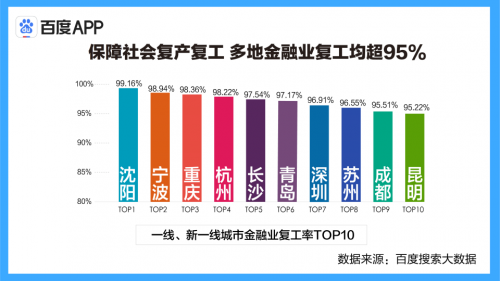 其中,多地金融業(yè)復(fù)工率超95%,保證了經(jīng)濟生活得以正常開展。沈陽、寧波、重慶、杭州等新一線城市排名前列。