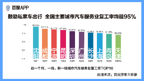 疫情帶來的風(fēng)險尚未完全消失,為了減少接觸,復(fù)產(chǎn)復(fù)工時,私家車出行增多。百度搜索大數(shù)據(jù)顯示,全國主要城市汽車服務(wù)業(yè)復(fù)工率均超過95%,沈陽市再次位居榜首。