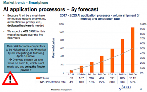 很多創(chuàng)業(yè)公司和他們的投資方都有很大的機會。2019年5月在硅谷召開發(fā)布會的Embedded Vision Alliance (嵌入式視覺聯(lián)盟)創(chuàng)始人Jeff Bier(杰夫·比爾)表示,過去三年,投資者向人工智能芯片初創(chuàng)企業(yè)投入了約15億美元,超過了對其他所有芯片初創(chuàng)企業(yè)的投資。市場研究機構(gòu)Yole Développement 預(yù)測,到2023年,人工智能處理器的復(fù)合年增長率將達(dá)到46%,屆時幾乎所有的智能手機都將使用AI處理器,而現(xiàn)在的使用率還不到20%。