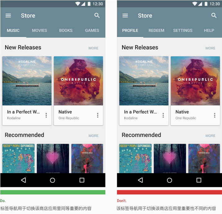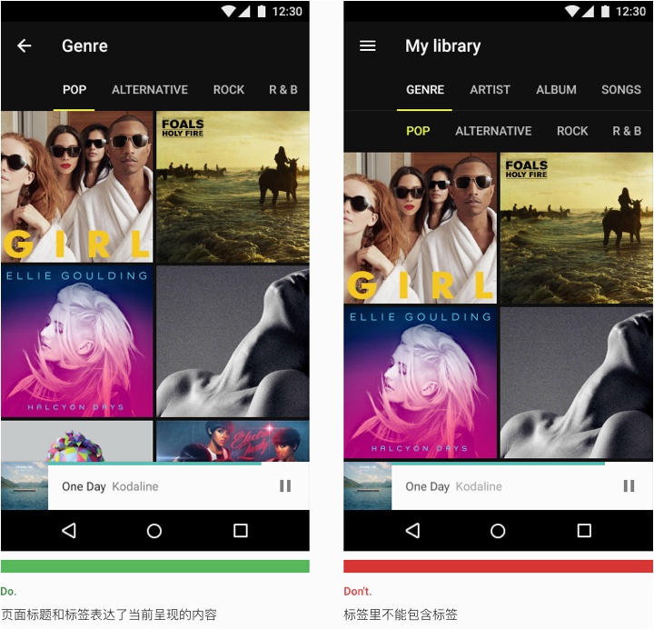 一個(gè)標(biāo)簽里的所有內(nèi)容應(yīng)該屬于一個(gè)大分類(比如“設(shè)置”或者“音樂(lè)”),并且標(biāo)簽之間內(nèi)容不能有重疊。標(biāo)簽可以包含圖標(biāo)(icon)和文字。如果使用文字,則盡量簡(jiǎn)短。