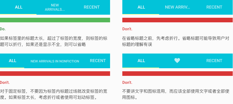 標(biāo)簽(tabs)使內(nèi)容在一個(gè)較高的層級(jí)被組織起來(lái)。一般,一個(gè)標(biāo)簽里需要展示與該標(biāo)簽相關(guān)的內(nèi)容。標(biāo)簽的名字需要清楚地描述該標(biāo)簽里所包含的內(nèi)容。