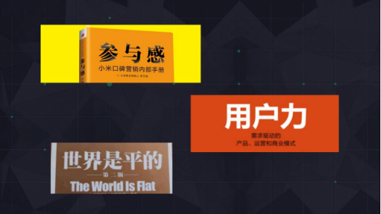比如說(shuō)這三本書(shū)的標(biāo)題,《參與感》,大家知道參與這個(gè)詞是很熟悉的,但是加了一個(gè)“感”字,“參與感”就有點(diǎn)陌生了,讓人好奇。《世界是平的》,其實(shí)大家都知道世界是不平的,是個(gè)球形,這個(gè)標(biāo)題也讓人好奇。《用戶力》也是同樣的道理。這三本書(shū)都是暢銷書(shū),你們可以從他的書(shū)名里感覺(jué)出來(lái),給你一種既熟悉又陌生的感覺(jué)。